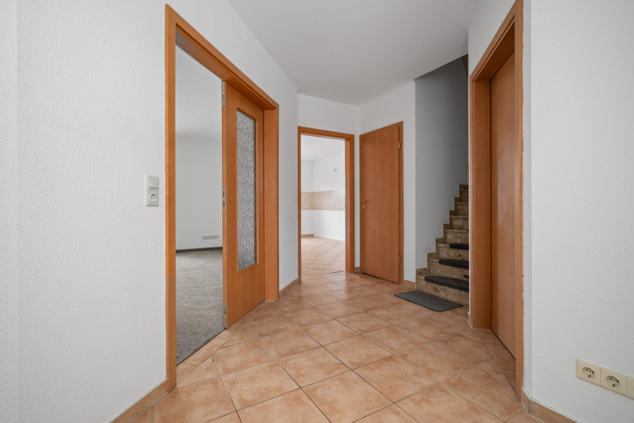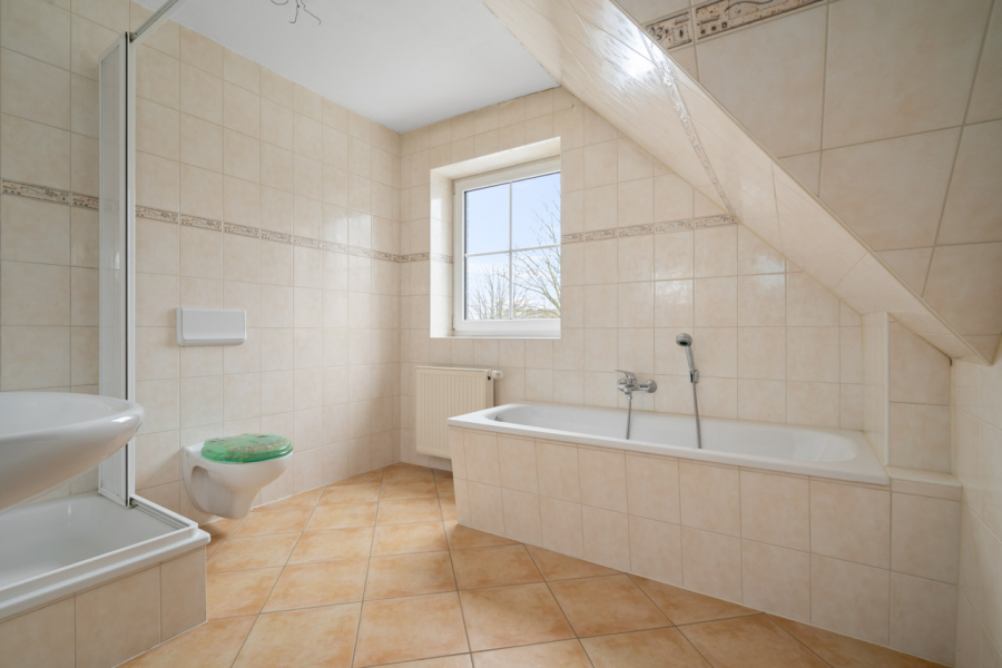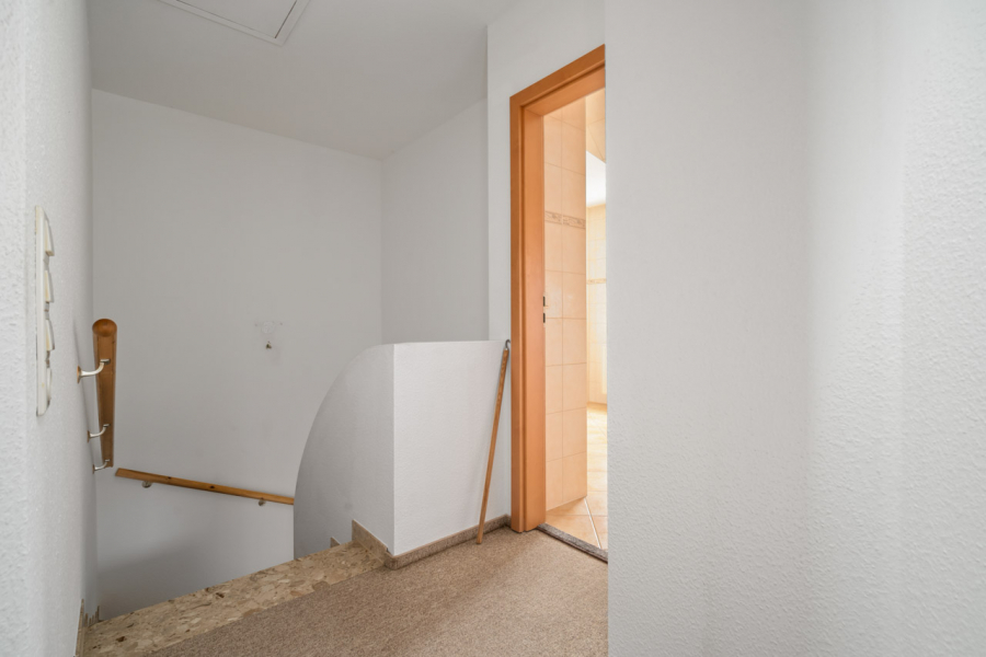 Über eine solide Betontreppe erreichen Sie das Dachgeschoss. Hier befinden sich drei großzügige Schlafzimmer, die vielfältige Nutzungsmöglichkeiten bieten, sowie ein voll ausgestattetes Badezimmer mit Dusche, Badewanne, Hänge WC und Waschbecken mit Halbsäule.