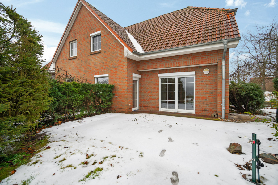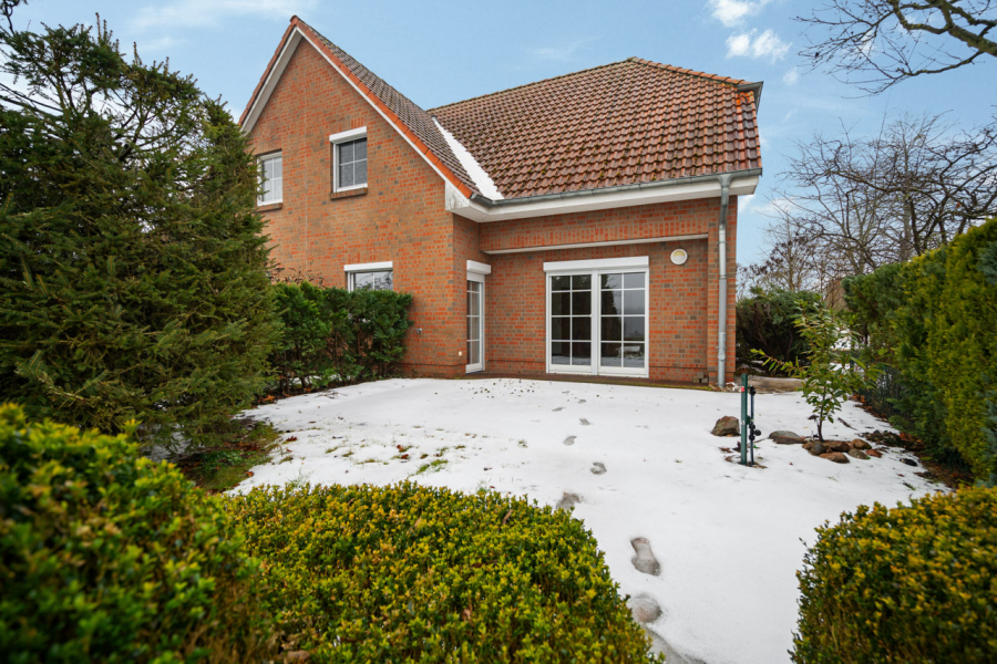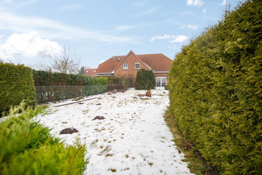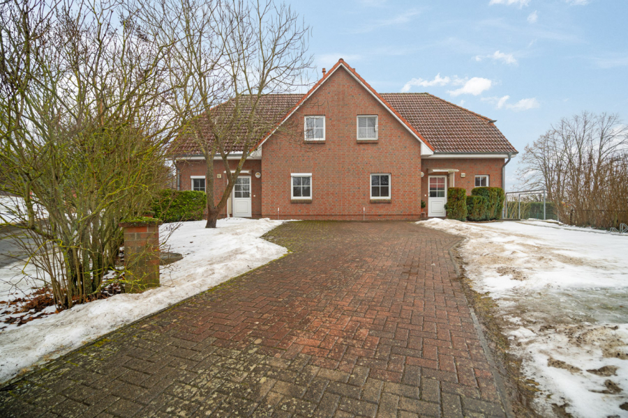 Die Fassade ist als ansprechendes Verblendmauerwerk ausgeführt und unterstreicht den soliden und zeitlosen Charakter der Immobilie. Jede Haushälfte verfügt über ein großzügiges Grundstück von etwa 1000 Quadratmetern. Die weitläufigen Gartenflächen schaffen ein hohes Maß an Privatsphäre und eröffnen vielfältige Möglichkeiten zur persönlichen Entfaltung. Zu jeder Einheit gehört ein Doppelcarport, sodass komfortable Stellplatzmöglichkeiten direkt am Haus gegeben sind.